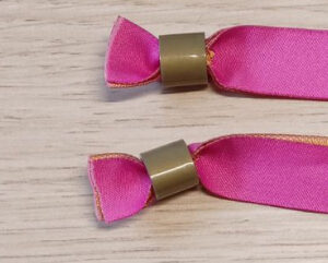 Satin ist ein eher dünnes, glänzendes, sehr weiches feines glattes und angenehmes Material, auch bekannt von Geschenkband oder feiner Damenunterwäsche, häufig verwendet für noble Anlässe (Hochzeiten, Kongresse, etc.) aber auch normale Festivals. Das Material ist besonders langlebig und es wird aufgrund der feinen glatten Oberfläche ein optimales Druckergebnis erzielt. Da diese Stoffbändchen sehr dünn und glatt sind, greifen die spitzen Widerhaken im Verschluss nicht immer hundertprozentig zuverlässig und die Stoffbänder könnten mit etwas Geschick wieder geöffnet und weitergegeben werden. Bei Satin 2cm funktioniert der Verschluss sicherer.