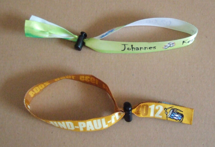 Daneben gibt es den Kordelstopper-Verschluss, siehe Foto. Jedem bekannt von Kapuzenjacken mit Kordel-Schnüren zum Zuziehen. Bei diesem Verschluss muss das Festivalbändchen 35 cm lang sein. Und die überstehenden Enden sollten nicht abgeschnitten werden, da sonst die Enden beim Öffnen aus dem Verschluss herausrutschen und nur mühselig wieder eingefädelt werden können.
