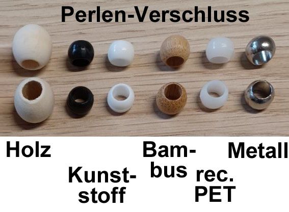 - Perlen: Bandlänge 35 cm notwendig; gibt es aus Kunststoff in schwarz oder weiss, aus Holz (Ahorn) oder Bambus (klein), aus Metall und aus recyceltem PET in weiss;