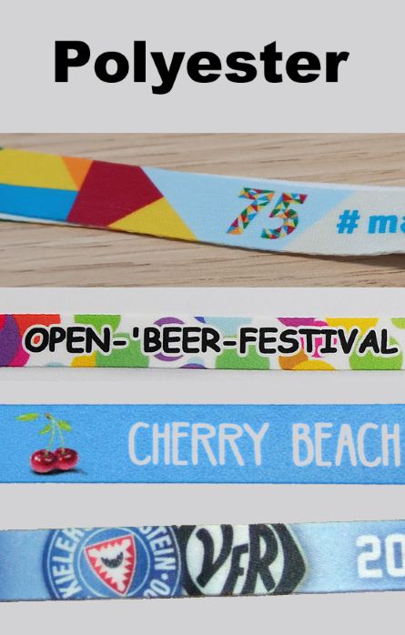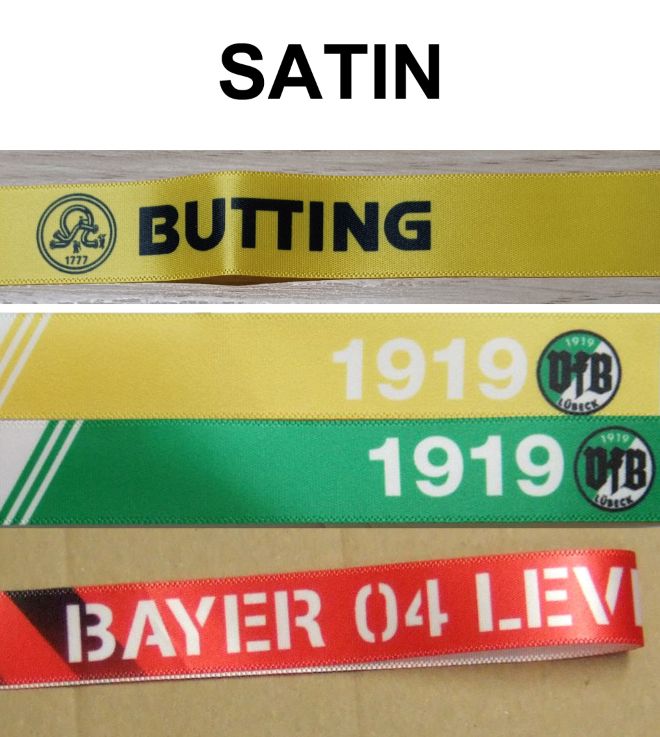 Bei der Machart wird zwischen GEWEBT und BEDRUCKT unterschieden. Gewebt bedeutet, dass auch Logo und Text aus Garn gewebt/gestickt sind. Bei bedruckt wird das komplette Design (also Hintergrund, Schrift und Logos) vollfarbig 4C randlos auf ein zuvor weißes Textilmaterial gedruckt. Der Druck kann auf das dünne Satin, das deutlich dickere Polyester oder das nachhaltige ebenfalls dicke recycelte PET erfolgen.