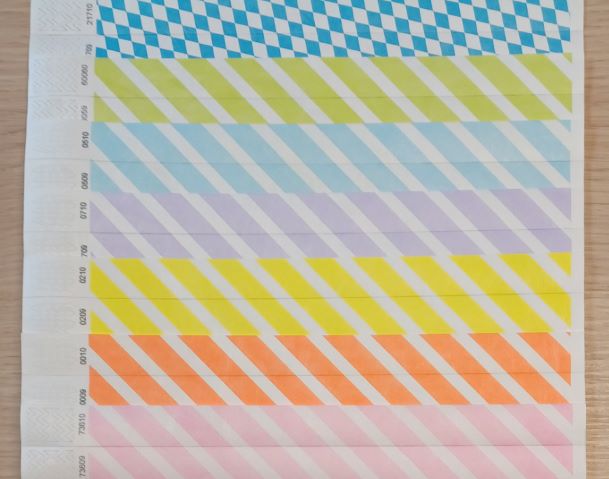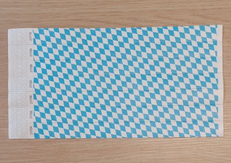Bei diesen Einlassbändchen handelt es sich um weiße Eintrittsbändchen, die bereits mit bestimmten Motiven bedruckt sind. Diese Eigenschaft verleiht dem Kontrollarmband eine hohe Fälschungssicherheit, da es sich um einmalige Muster handelt. Preislich sind die VIP-Bändchen deutlich attraktiver als individuell nach Druckvorlage bedruckte Kontrollbändchen. Ab sofort gibt es die Tyvek Bändchen auch im Bayerischen Rautenmuster weiss-blau, ideal für Oktoberfest oder eine Veranstaltung mit Motto Bayern.